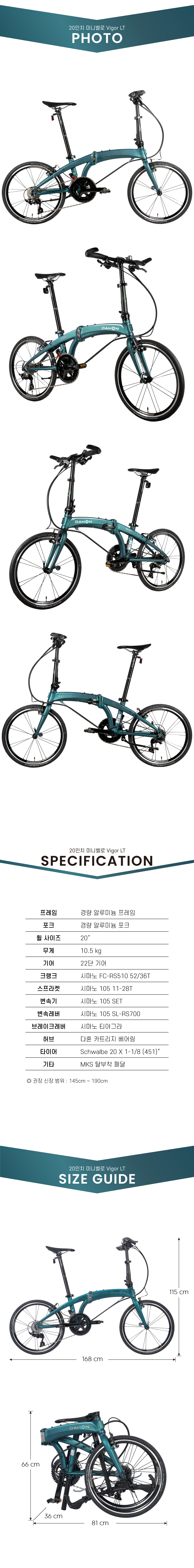 SPEED 22단품명DAHON VIGOR LT 22프레임경량 알루미늄 프레임포크경량 알루미늄 포크변속기시마노 105 SET휠셋 휠셋크기(폴딩)64x80x40cm무게11.9kg추천신장145~190cm허용체중105kg자율안전인증번호B401R226-24001 / 한국건설생활환경시험연구원(KCL)제조사 / 수입사DAHON (중국)품질보증소비자보호법시행령에 의한 품질보증기타기타 사항은 상세페이지 참조* 이 규격은 제조사 사정으로 예고없이 변경될 수 있습니다.