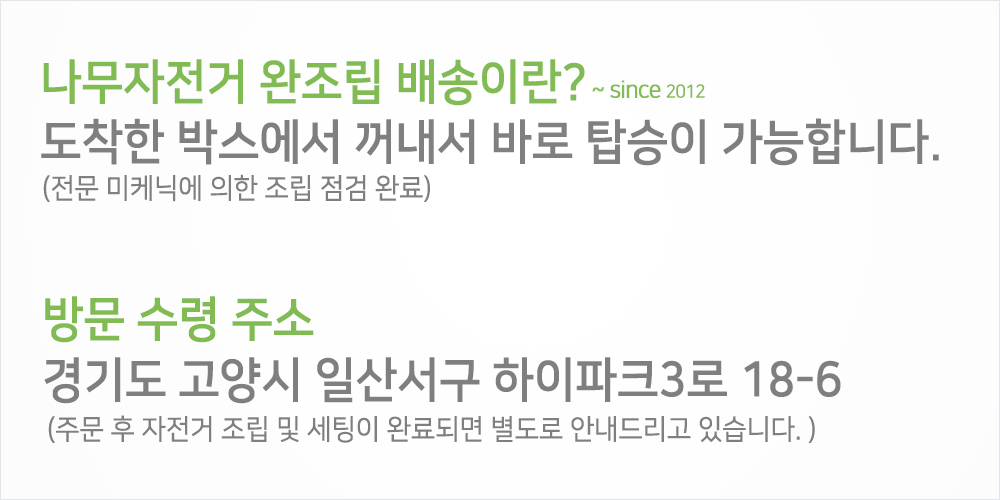 기한다운로드 후 7일나무자전거 완조립 배송이란?받으신 자전거는 박스에서 꺼내는 즉시 주행이 가능합니다. 전문 미케닉이 세밀한 조립과 점검을 완료한 상태로 출고해 드립니다.※비조립 배송 제외