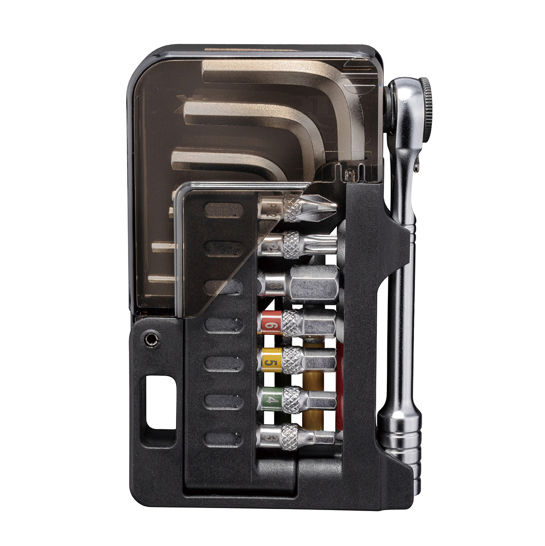 옴니 툴카드볼 엔드 육각 렌치 세트가 포함된 놀라울 정도로 컴팩트한 15기능 래칫 세트입니다. 7개의 래칫 비트와 7개의 볼 엔드 알렌 렌치가 혁신적인 접이식 수납 케이스에 들어 있어 저지 주머니나 안장 가방에도 쏙 들어갑니다.