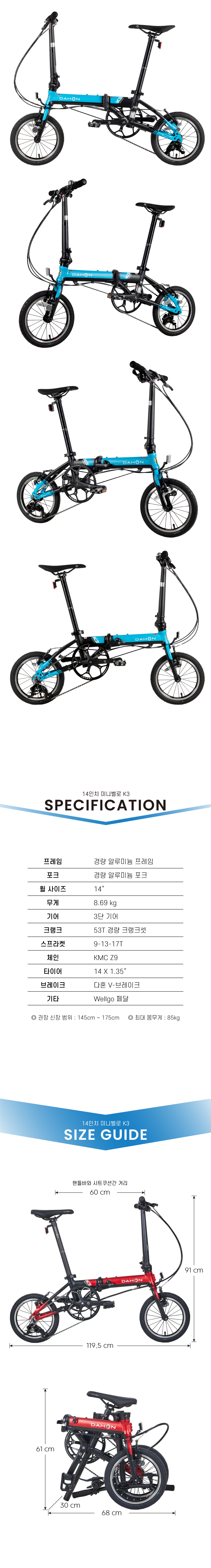 14인치 3단 경량 접이식자전거품명DAHON K3 SPEED 3프레임경량 알루미늄 프레임포크경량 알루미늄 포크휠셋 휠셋크기(폴딩)61x68x30cm무게8.69kg추천신장145~175cm허용체중85kg인증번호B401R226-24001 / 한국건설생활환경시험연구원(KCL)제조사 / 수입사DAHON (중국)품질보증소비자보호법시행령에 의한 품질보증기타기타 사항은 상세페이지 참조* 이 규격은 제조사 사정으로 예고없이 변경될 수 있습니다.