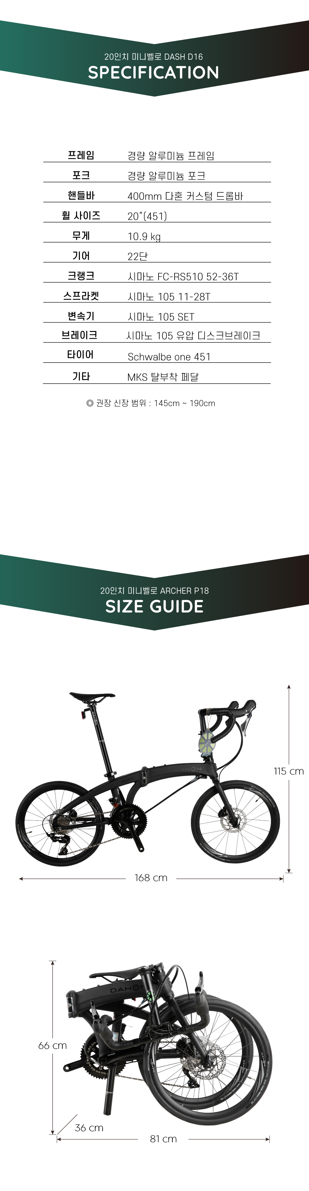 SPEED 22단품명DAHON VIGOR LT DROPBAR 22프레임경량 알루미늄 프레임포크경량 알루미늄 포크변속기시마노 105 SET휠셋 휠셋크기(폴딩)66x81x36cm무게10.9kg추천신장145~190cm허용체중105kg자율안전인증번호B401R226-24001 / 한국건설생활환경시험연구원(KCL)제조사 / 수입사DAHON (중국)품질보증소비자보호법시행령에 의한 품질보증기타기타 사항은 상세페이지 참조* 이 규격은 제조사 사정으로 예고없이 변경될 수 있습니다.