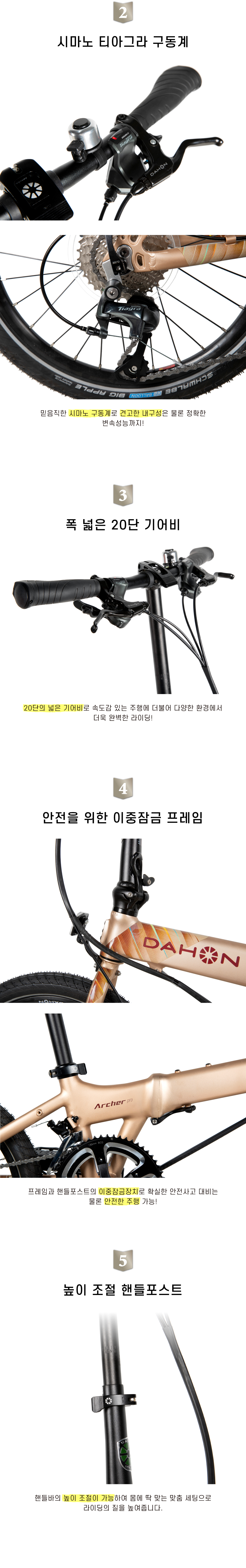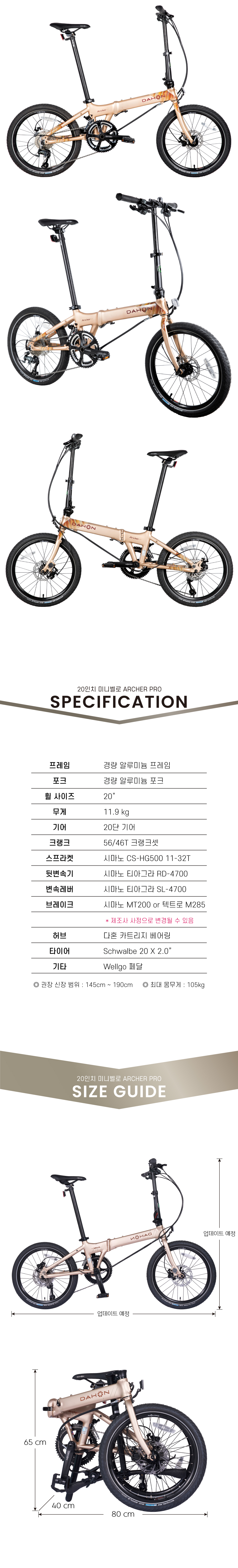 SPEED 20단품명DAHON ARCHER PRO 20프레임경량 알루미늄 프레임포크경량 알루미늄 포크변속기시마노 타아그라휠셋 휠셋크기(폴딩)65x80x40cm무게11.9kg추천신장145~190cm허용체중105kg인증번호B401R226-24001 / 한국건설생활환경시험연구원(KCL)제조사 / 수입사DAHON (중국)품질보증소비자보호법시행령에 의한 품질보증기타기타 사항은 상세페이지 참조* 이 규격은 제조사 사정으로 예고없이 변경될 수 있습니다.