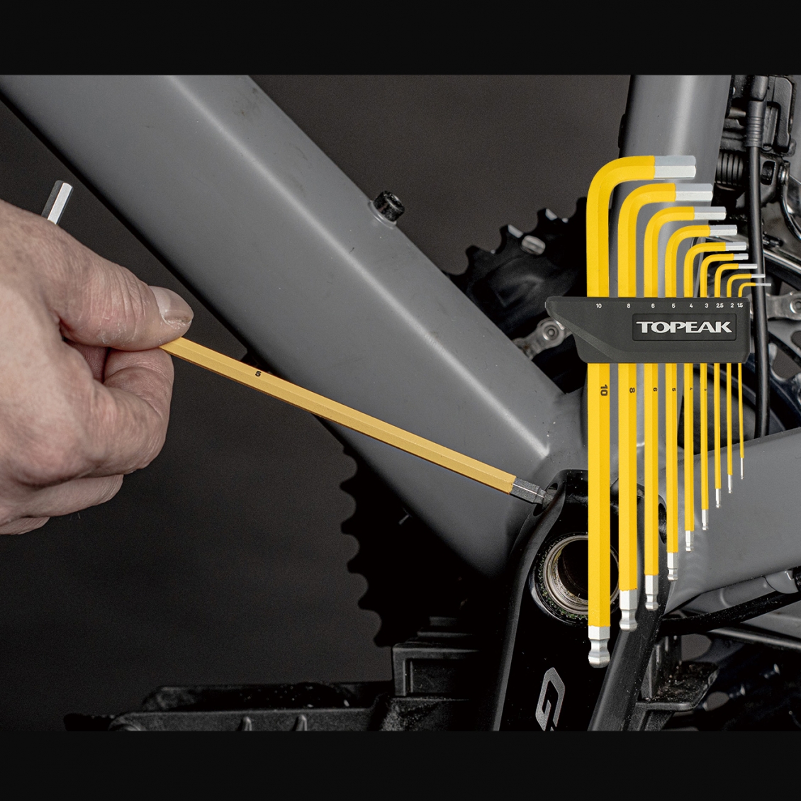 듀오헥스 렌치 세트 DX1.5mm부터 10mm까지의 다양한 육각 사이즈(1.5, 2, 2.5, 3, 4, 5, 6, 8, 10mm)를 포함하고 있으며, 정밀한 볼 포인트 설계로 나사를 비스듬한 각도에서도 편리하게 조일 수 있습니다.