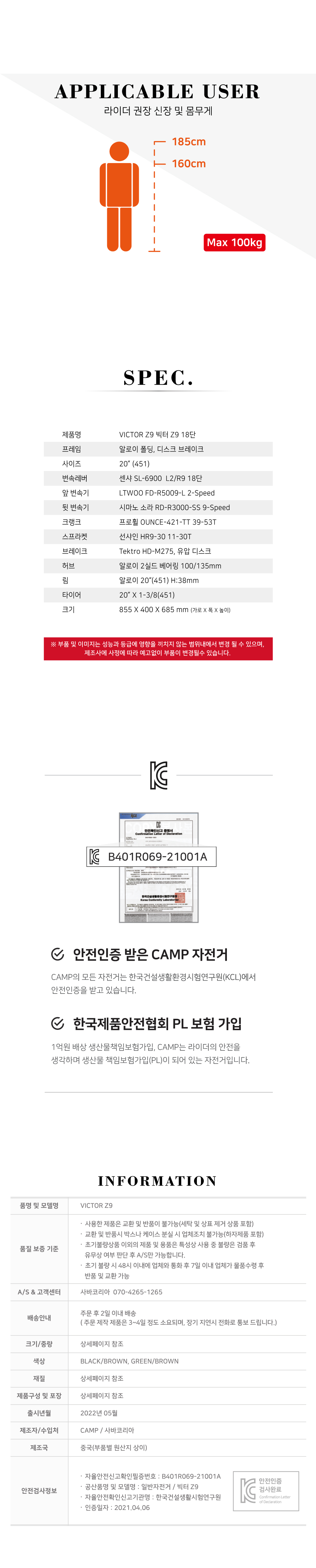 유압 디스크 브레이크품명CAMP VICTOR Z9프레임알로이 프레임변속기시마노 소라 R3000브레이크텍트로 유압 디스크휠셋20인 451크기(폴딩)85x40x68cm추천신장160~185cm허용체중100kg안전검사번호B401R069-21001A제조사 / 수입사SAVA (중국)품질보증소비자보호법시행령에 의한 품질보증기타기타 사항은 상세페이지 참조* 이 규격은 제조사 사정으로 예고없이 변경될 수 있습니다.