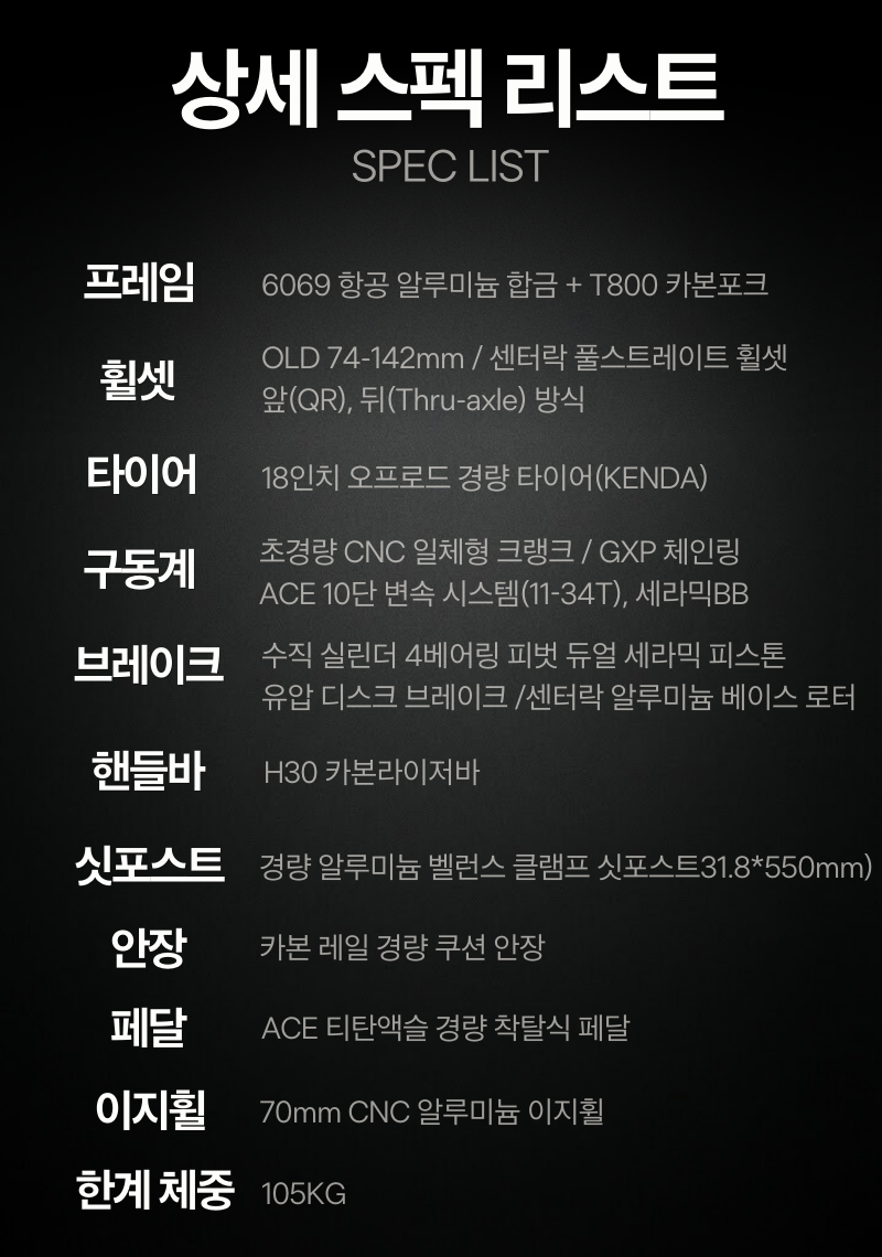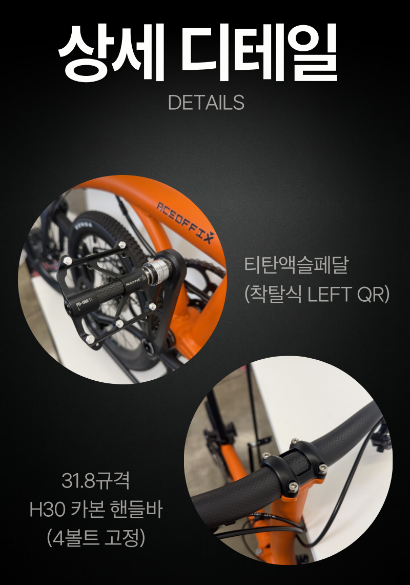 최대하중 105kg품명Aceoffix ACE D10프레임6069 알루미늄 프레임포크T800 카본 포크변속기트라이폴드10단 전용 변속기브레이크유압 디스트 브레이크휠셋18인치 휠셋 355크기(폴딩)65 x 64 x 35무게약 8.5kg제조사 / 수입사Aceoffix (중국)품질보증소비자보호법시행령에 의한 품질보증기타기타 사항은 상세페이지 참조* 이 규격은 제조사 사정으로 예고없이 변경될 수 있습니다.
