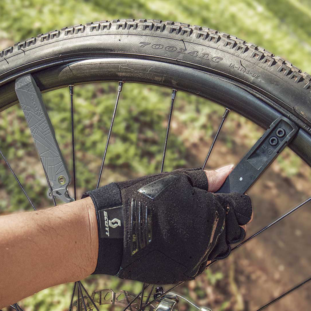 통합 체인 후크는 링크를 제거하거나 설치하는 동안 체인이 분리되는 것을 방지합니다. 하나의 완전한 체인 링크가 공구 내에 보관됩니다. 공구는 빠른 타이어 수리를 위해 두 개의 레버로 분리되어 사용 가능하며 밸브 코어 제거를 위한 프레스타 코어 공구가 내장되어 있습니다.